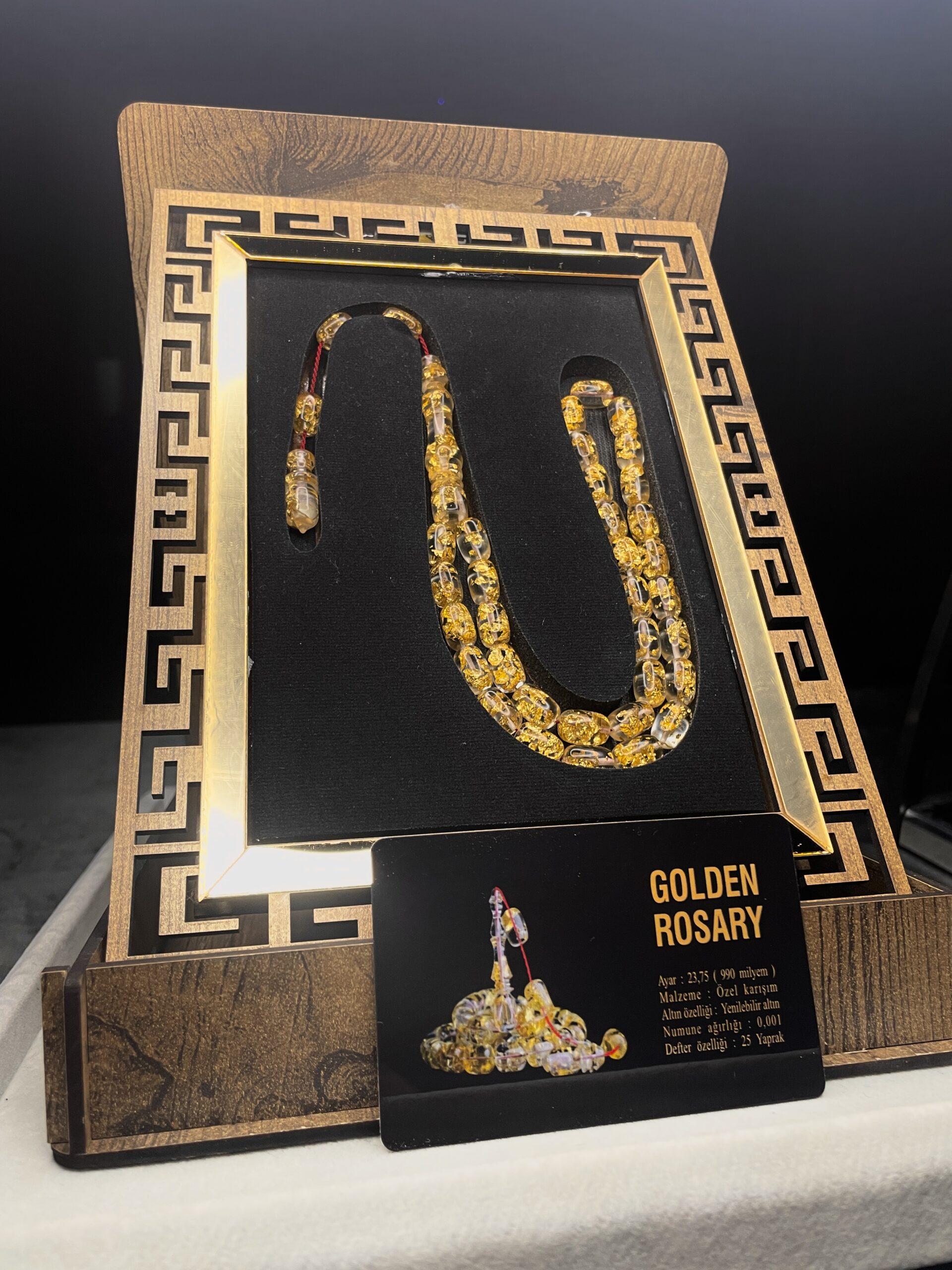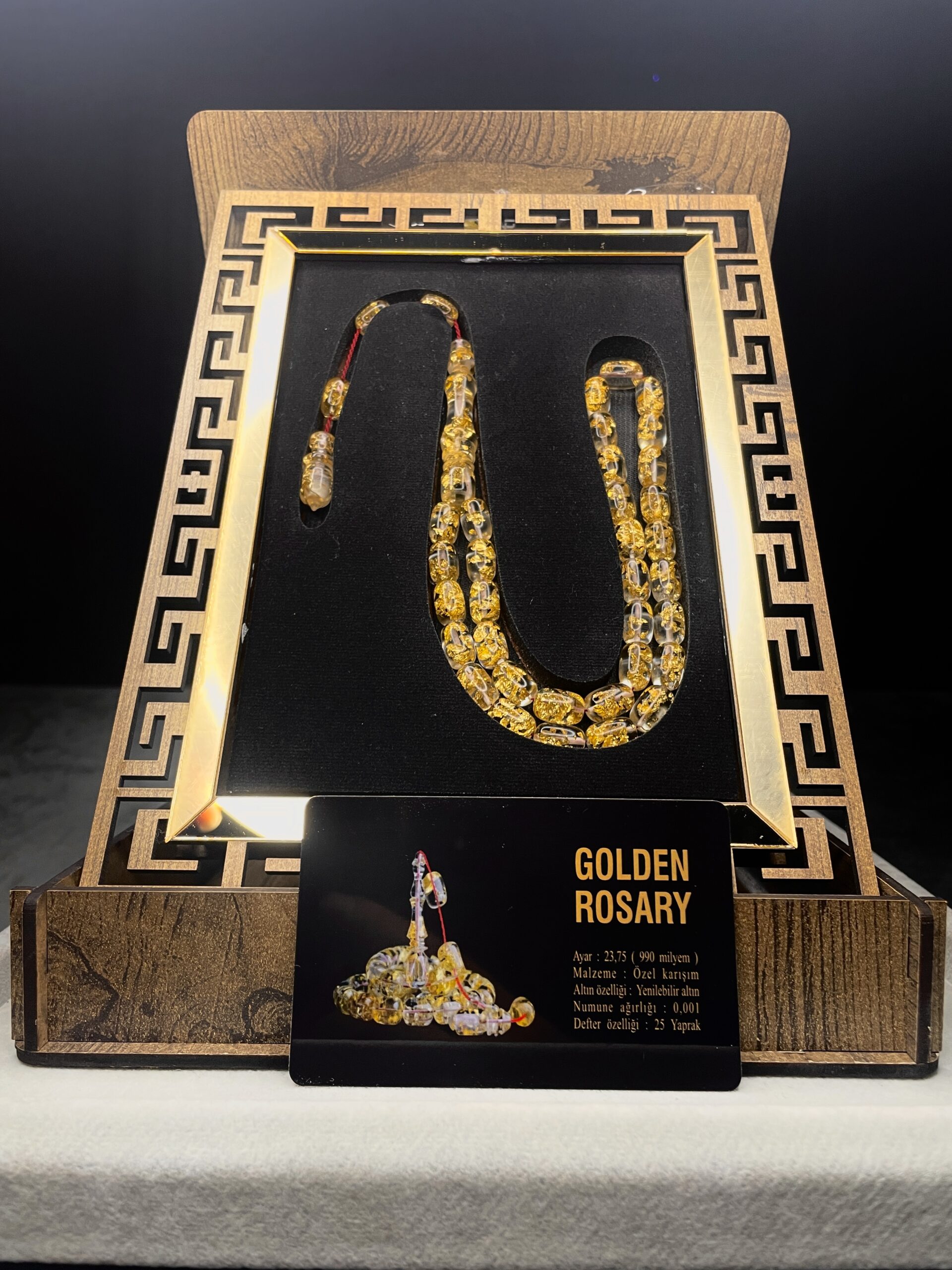 24 Ayar Altın Parçacıklı Uçak Camı Golden Rosary Özel Tasarım Ahşap Kutulu Tesbih